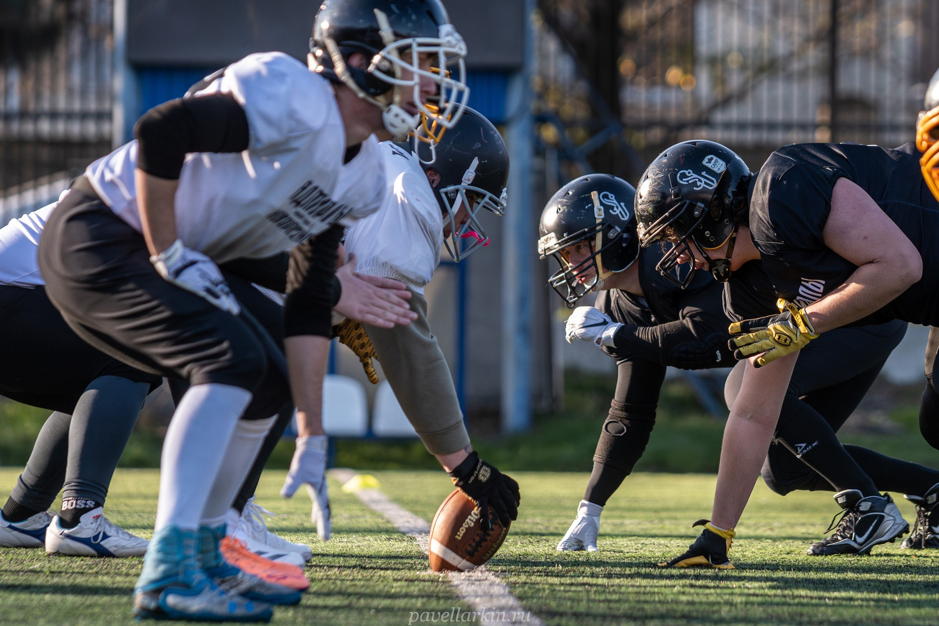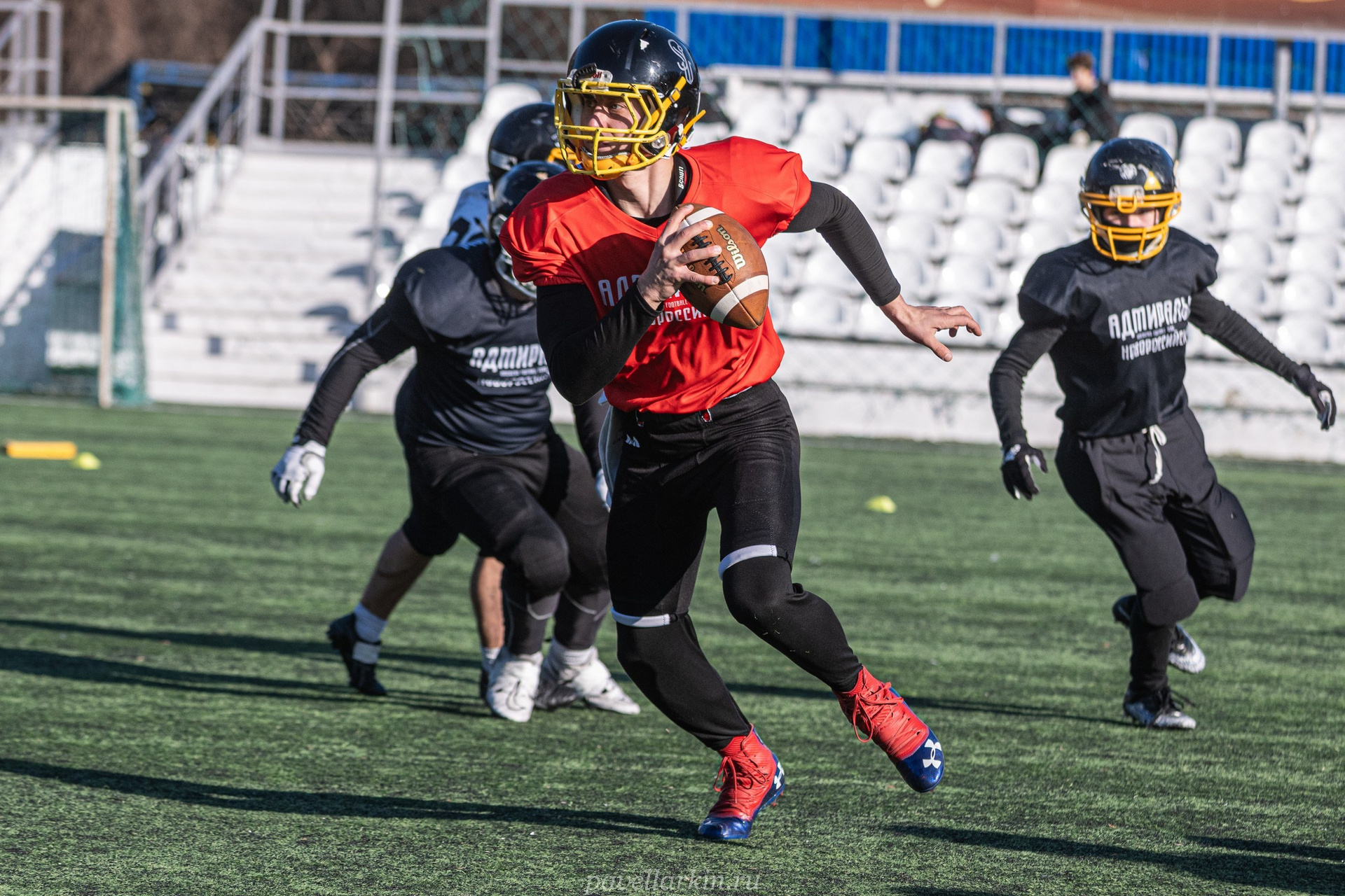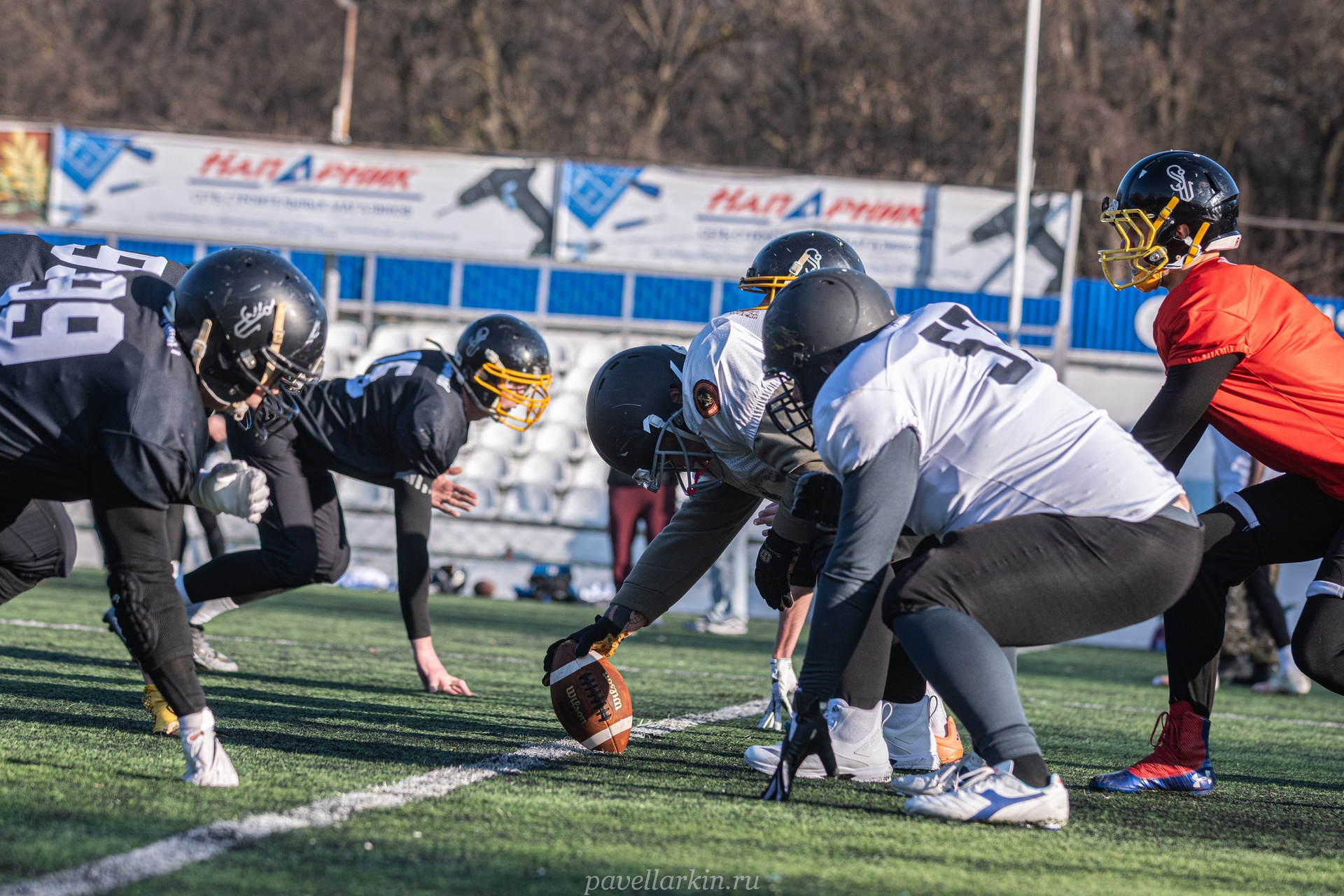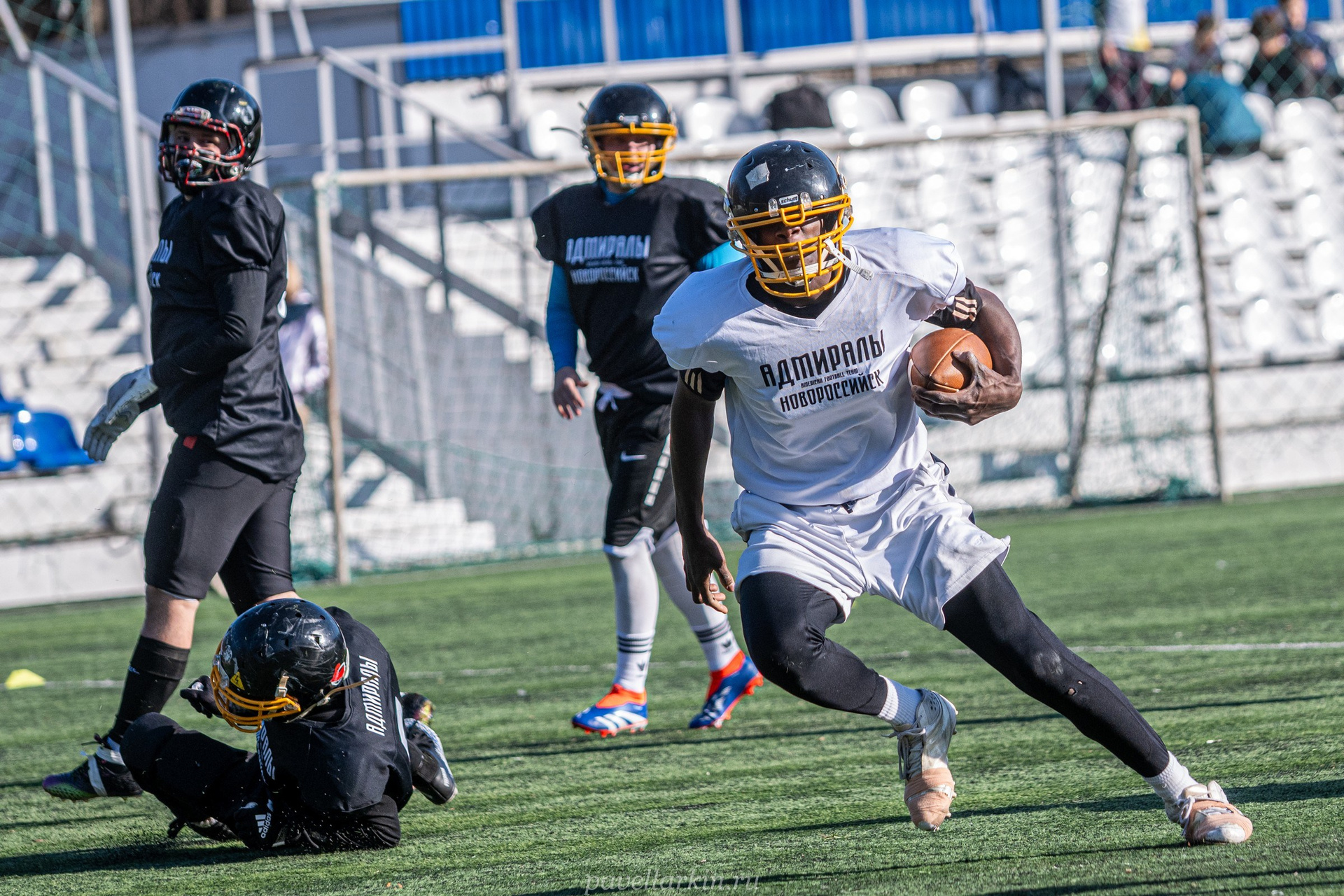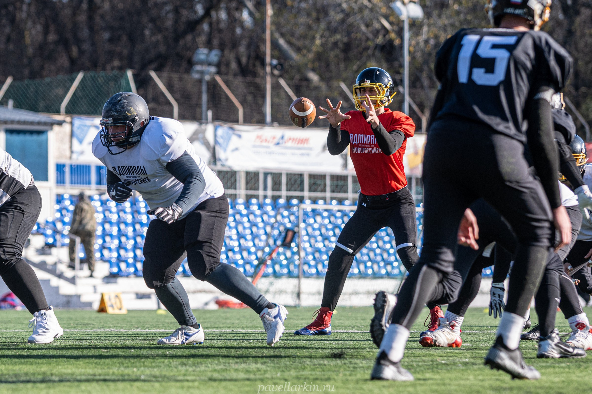 8 декабря 2025 года, стадион «Строитель» города Новороссийск. Команда по американскому футболу «Адмиралы» проводит заключительную тренировочную игру на своем поле — скриммидж. Играют «Адмиралы в белом» (атакующий состав) против «Адмиралов в черном» (состав защиты).